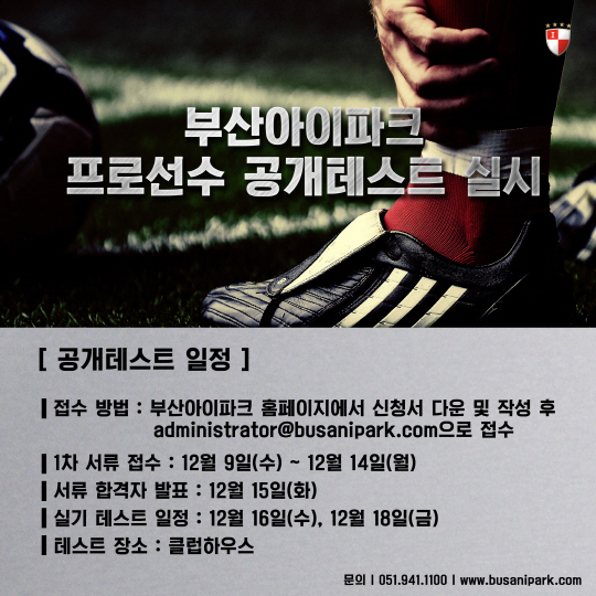 서류 심사와 실기 테스트로 나눠 진행되는 공개테스트에 참가를 원하는 선수는 부산아이파크 공식 홈페이지의 공지사항을 통해 제출 서류를 내려 받은 후 이메일(administrator@busanipark.com)로 신청하면 된다.