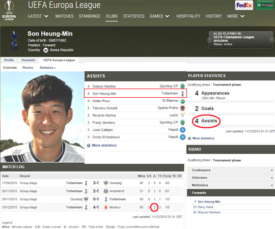 당초 경기 직후 UEFA는 이날 경기에서 손흥민의 두 번째 도움만을 집계, 이날 손흥민의 기록을 1도움으로 발표했다. 하지만 경기 후 라멜라의 2번째 골도 손흥민의 도움으로 추가됐다.