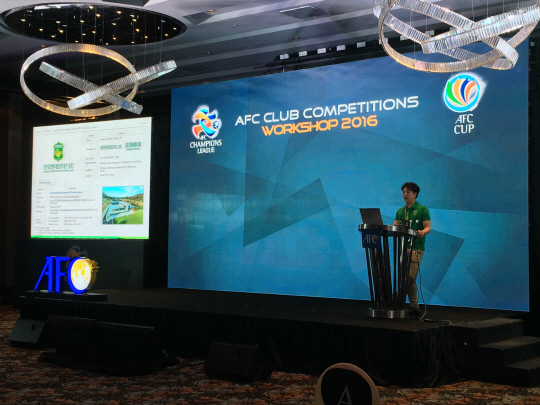 11일 말레이시아 쿠알라룸푸르에서 열린 2016년 아시아축구연맹 클럽대회 워크숍에서 전북의 마케팅팀 신정민 사원이 '지역밀착 마케팅 및 유소년 시스템' 우수사례를 발표하고 있다. 사진제공=프로축구연맹