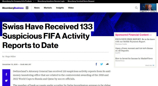 이어 스위스 검찰은 7월 "FIFA의 2018년, 2022년 월드컵 개최지 선정 관련 자금세탁 수사를 확대했다"면서 "자금세탁 신고실에서 통보받은 돈세탁 의심 거래가 81건으로 증가했다"고 밝혔다.