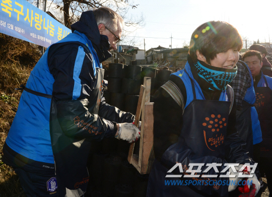 대한축구협회가 사랑의 연탄나르기 봉사활동을 펼쳤다. 16일 오후 서울 중계동 104마을에서 열린 'KFA와 함께 하는 사랑의 연탄나르기' 행사에서 슈틸리케 감독이 지소연에게 연탄을 전달하고 있다. 정재근 기자 cjg@sportschosun.com