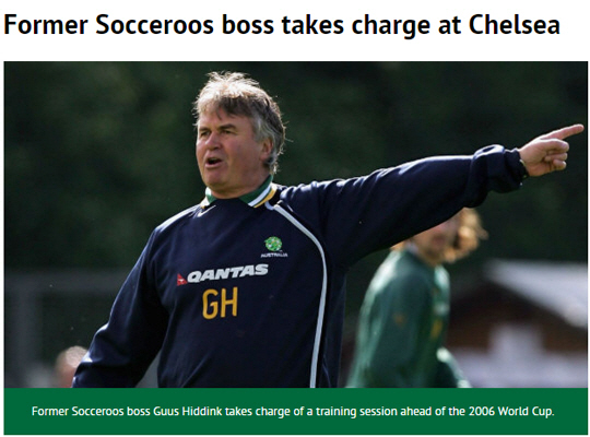 호주축구협회는 18일(한국 시각) 공식 홈페이지를 통해 "전 호주대표팀 감독이었던 히딩크가 경질된 무리뉴를 대신해 첼시의 임시 사령탑을 맡게 됐다"라고 밝혔다. 아직 첼시 측은 새로운 사령탑에 대해 공식 입장을 밝히지 않은 상태다. 히딩크는 지난 2006년 호주대표팀을 월드컵 16강에 올려놓은 인연이 있다.