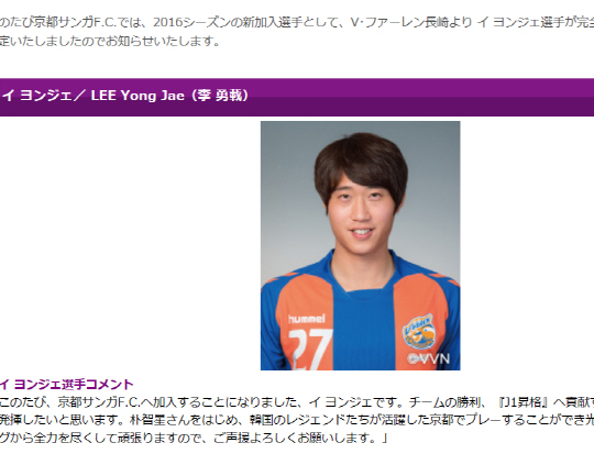 교토 구단은 19일 이용재의 영입을 발표했다. 2014년 인천아시안게임 금메달의 주역인 이용재는 슈틸리케호에도 발탁돼 동아시안컵을 누볐다. 1m86dls 그는 나가사키에서 2014년과 2015년 49경기에 출전, 10골을 터트렸다.