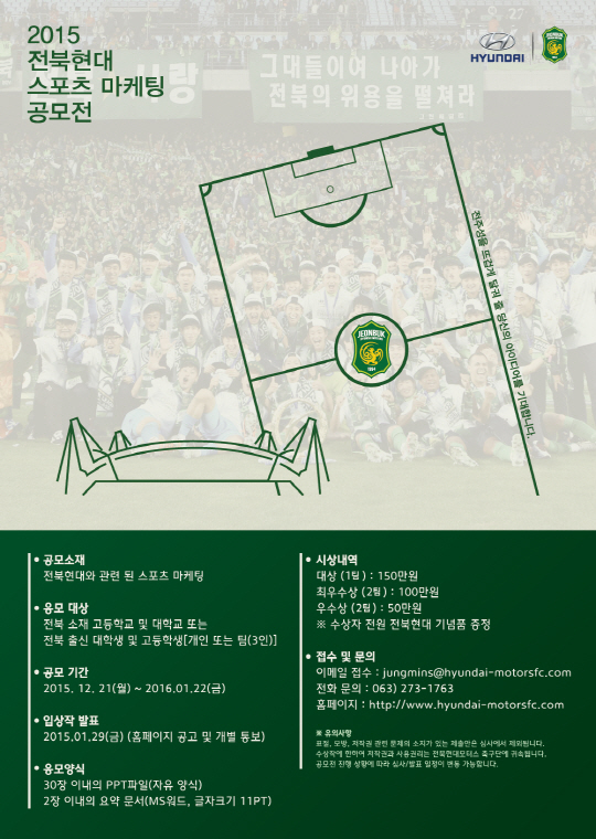이번 공모전은 2016년 1월 22일까지 접수를 받는다. 전북현대와 관련된 스포츠 마케팅 방안을 파워포인트 30장 이내와 2장 이내의 요약 워드문서 파일을 이메일(jungmins@hyundai-motorsfc.com)로 제출하면 된다.
