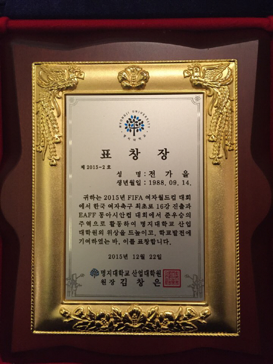 전가을은 지난 22일 오후 서울 남산 밀레니엄서울힐튼호텔에서 열린 명지대학교 산업대학원 원우회 주최 '2015년 자랑스런 명지인 송년의 밤' 행사에서 자랑스런 명지인상을 수상했다. 명지대학교 주임교수 심사위원회를 통해 교수 1명, 재학생 1명에게만 주어지는 수상의 영예를 안았다. 국제축구연맹(FIFA) 캐나다여자월드컵 사상 첫 16강, 동아시안컵 준우승의 주역으로 활약하며 명지대 대학원의 위상을 드높이고, 학교발전에 기여한 공을 인정했다. 공부와 운동을 치열하게 병행하며, 학교의 명예를 빛낸 공로를 인정받았다. '윤덕여호의 테크니션' 전가을은 내년 4월 대한민국 여자축구선수로는 최초로 미국 여자축구리그에 입성한다. 전영지 기자 sky4us@sportschosun.com