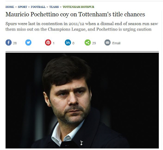 손흥민의 토트넘을 지휘하고 있는 마우리시오 포체티노 감독이 시즌 우승 가능성에 대해 몹시 신중한 입장을 나타냈다.