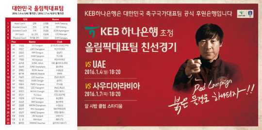 대한축구협회는 공식후원사인 KEB하나은행과 함께 UAE(아랍에미리트) 두바이에 열리는 올림픽대표팀의 평가전 경기에서 공동응원 캠페인을 펼친다.
