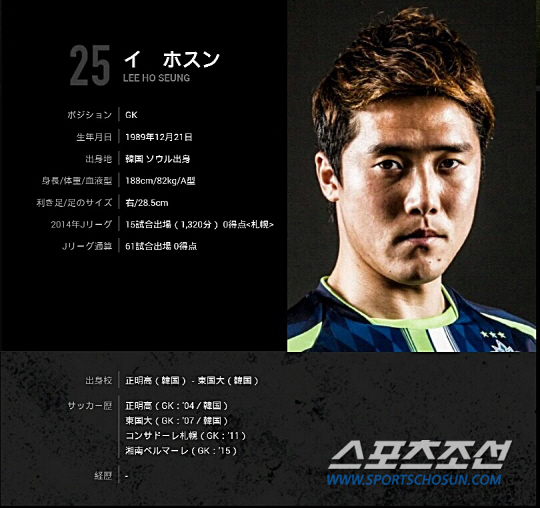 이호승은 '동국대 2년 선배' 김진현(세레소 오사카)과 함께 J리그에서 5년째 활약해온 젊은 골키퍼다. 안정적이고 침착한 수비 조율 능력으로 좋은 평가를 받았다. 2011년 동국대 재학중 일본 J2리그 곤사돌레 삿포로행을 택한 이호승은 첫시즌 36경기를 뛰며 팀의 1부리그 승격에 혁혁한 공을 세웠다. 주전 골키퍼 다카기 다카히로의 백업으로 입단했지만 다카기의 부상으로 찾아온 뜻밖의 기회를 놓치지 않았다. 첫시즌 36경기 30실점으로 경기당 0.83골의 눈부신 선방쇼를 펼치며 '삿포로 돔 MVP'에 선정되는 등 맹활약했다. 2012년에도 10경기에 나섰지만 시즌중 왼쪽 아킬레스건파열 부상으로 수술대에 오르며 극심한 슬럼프도 겪었다. 2014년 15경기에 나서며 부활했고, 2015년 1부리그 쇼난 벨마레로 이적해 1경기에 나섰다. 강인한 멘탈을 지닌 젊은 수문장으로 삿포로 등 J리그 팬들의 두터운 신임을 받아왔다. 전영지 기자 sky4us@sportschosun.com