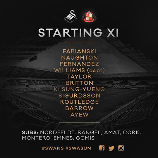 최전방에는 아예우가 포진하고, 2선에는 바로우, 라우틀리지, 시구르드손이 나선다. 더블볼란치(2명의 수비형 미드필더)에는 기성용과 브리튼이 선다. 포백은 테일러, 윌리엄스, 페르난데스, 노튼이 이루며, 골문은 파비안스키가 지킨다.
