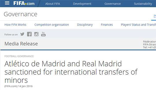 FIFA는 14일 지난 2014년 바르셀로나가 받았던 '유소년 영입규정 위반으로 인한 선수 등록 2차례 금지' 징계를 레알 마드리드와 AT마드리드에게 내린다고 공식 발표했다. 두 팀은 현재 진행중인 이번 겨울 이적시장을 제외하고, 다음 여름과 겨울 이적시장에서 선수를 영입하더라도 등록할 수 없다. 레알 마드리드와 AT마드리드는 항소에 나섰지만, 지난 바르셀로나 사례가 그렇듯 이들의 항소가 받아들여질 가능성은 낮다.