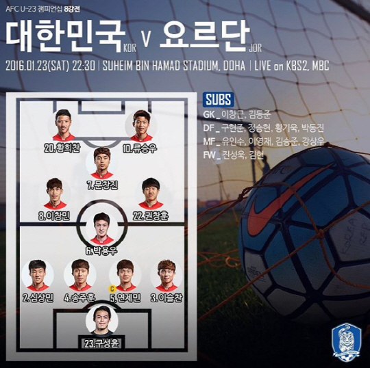 전반 23분 결실을 맺었다. 해결사는 문창진이었다. 페널티지역 왼쪽 앞에서 권창훈이 날카로운 크로스를 올렸다. 이를 요르단 수비수들이 제대로 걷어내지 못했다. 수비수 맞고 튕긴 볼을 류승우가 패스했다. 문창진이 가볍게 오른발로 밀어넣었다. 문창진은 조별리그 1차전 우즈베키스탄과의 경기에서도 2골을 넣으며 승리를 이끈바 있다.