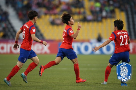 전반 23분 마침내 문창진의 선제골이 터졌다. 페널티박스 왼쪽에서 권창훈이 날카로운 크로스를 올린 직후 요르단 수비수들이 제대로 걷어내지 못했다. 류승우가 톡하고 찍어준 패스를 이어받은 문창진이 왼발이 아닌 오른발로 골망을 흔들었다. 우즈베키스탄과의 1차전에서 멀티골을 터뜨린 문창진이 이번 대회 3골째를 기록했다.