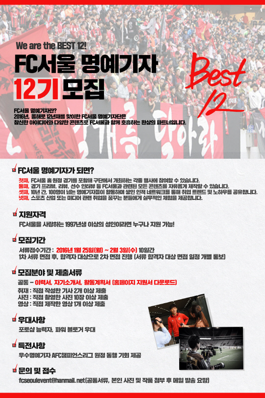 FC서울 명예기자는 FC서울을 사랑하고 축구에 대한 열정을 가진 20세 이상(2016년 기준) 성인이라면 누구나 지원 가능하며 취재, 사진, 영상 세 개의 분야를 모집한다. 지원기간은 25일부터 2월 3일까지 10일 동안 진행되며 FC서울 홈페이지에서 지원서를 다운 받아 이메일(fcseoulevent@hanmail.net)을 통해 접수하면 된다.