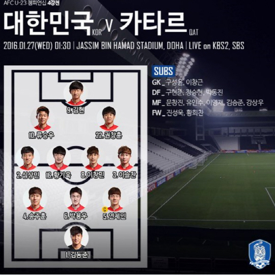 카타르의 공세에 밀리던 한국은 25분 '막내' 황기욱이 멋진 개인기로 슈팅까지 연결하며 분위기 반전에 나섰다. 32분에는 김 현이 머리로 떨궈준 볼을 류승우가 슈팅했지만 아쉽게 빗나갔다. 한국은 전반 종반부터는 주도권을 잡았지만 결정적인 기회를 만들지는 못했다. 결국 전반은 0-0으로 마무리됐다.