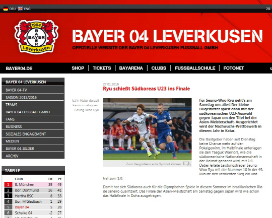 독일 레버쿠젠 구단이 28일(한국시각) 리우올림픽행을 결정지은 소속팀 공격수 류승우(레버쿠젠)의 활약을 홈페이지를 통해 팬들에게 알렸다.