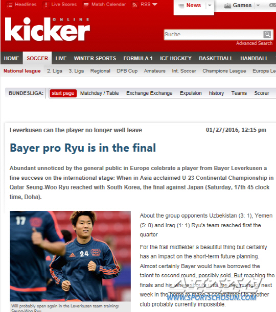 한편 독일 축구전문지 '키커' 역시 레버쿠젠 소속 공격수 '류(Ryu)'의 활약과 향후 거취에 대한 관심을 드러냈다. '류승우는 훌륭한 활약을 펼쳤다. 이는 분명 단기적인 미래 계획에도 영향을 미칠 것으로 보인다'고 썼다.