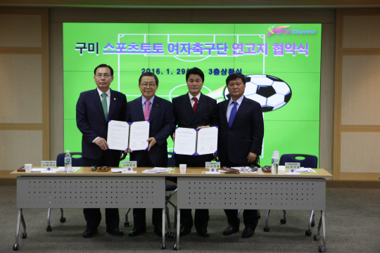 체육진흥투표권(스포츠토토) 수탁사업자인 ㈜케이토토와 구미시가 29일 오후 2시에 구미시청 3층 상황실에서 '스포츠토토 여자축구단' 연고지 협약을 했다.