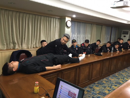 K리그 클래식 개막 준비에 한창인 상주 상무가 지난달 29일 경남 거제 전지훈련지에서 '과학적인 트레이닝 방법' 특강을 받았다.