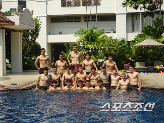 30분 서키트를 2세트 반복한 후에야 지옥 훈련이 끝났다. 땀에 흠뻑 젖은 선수들은 웨이트장 바로 옆 풀로 직행했다. 죽을 것같이 역기를 들어올리던 선수들에 비로소 땀흘린 자의 미소가 흘렀다. 후배들이 '캡틴' 최효진을 번쩍 들어올려 물에 빠뜨리는가 싶더니 너나 할 것 없이 풍덩풍덩 물에 뛰어들기 시작했다. 환한 미소와 함께 단체샷 포즈를 취했다. 상의 탈의한 선수들의 몸에는 치열한 훈련의 결실이 오롯하게 새겨져 있었다.