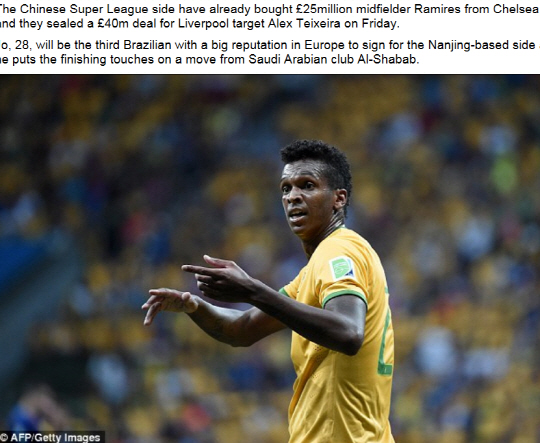 장쑤는 조를 영입하는데 200만 유로(약 27억원)의 이적료를 지급한 것으로 전해졌다. 장쑤는 '차이나 머니'를 앞세워 첼시(잉글랜드)의 미드필더 하미레스(29·브라질)를 3300만유로(435억원)에 데려왔다. 또 샤흐타르 도네츠크(우크라이나)에 무려 5000만유로(670억원)의 이적료를 내고 미드필더 알렉스 테세이라(26·브라질)를 영입했다.