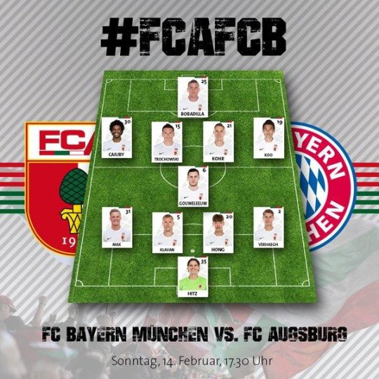 15일 1시 30분(한국시간) 독일 아우크스부르크 WWK아레나에서 열리는 독일 분데스리가 21라운드 아우크스부르크-바이에른 뮌헨전에서 구자철과 홍정호는 나란히 선발 라인업에 이름을 올렸다. 지동원은 가벼운 부상으로 인해 명단에서 제외됐다. 4-1-4-1 포메이션에서 구자철은 2선 오른쪽 날개로 나선다. 센터백 홍정호는 포백라인의 중심을 잡는다. 승점 53점의 '1강' 바이에른의 월드클래스 공격수 로베르트 레반도프스키,아르연 로번 등을 상대로 리그 14위 아우크스부르크가 안방에서 얼마나, 어떻게 버텨낼지가 관전 포인트다.