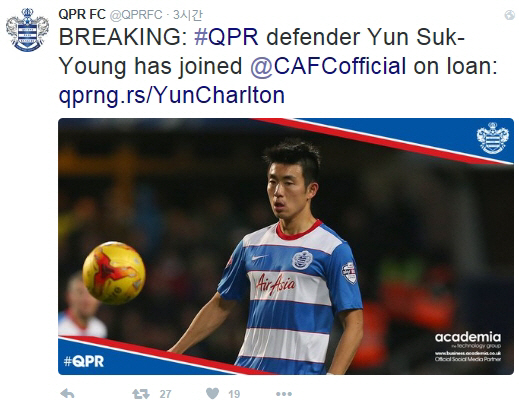 윤석영(26)의 찰턴 임대 소식에 퀸즈파크레인저스(QPR) 팬들이 소셜네트워크서비스(SNS)를 통해 진한 아쉬움과 분노를 쏟아내고 있다.
