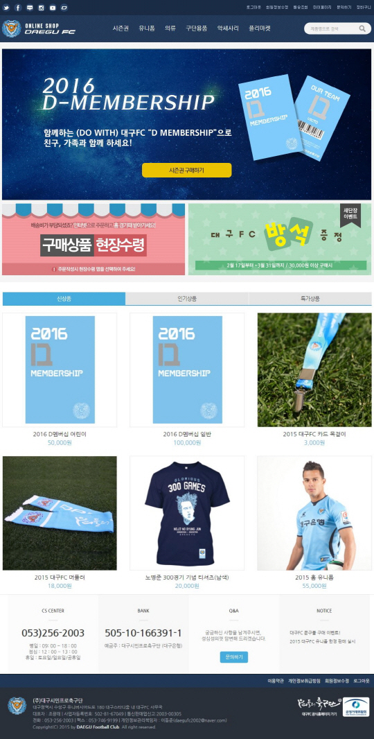 온라인 쇼핑몰도 새 옷으로 갈아입었다. 온라인 쇼핑몰은 이번 개편을 통해 유니폼, 의류, 악세사리 등 제품별로 카테고리를 재배치하고, 상품 구입 시 홈경기 당일 현장수령이 가능하도록 기능을 추가했다. 2016시즌 새로운 MD상품은 3월부터 순차로 공개 및 판매할 예정이다. 홈페이지 새단장을 기념하기 위해 3월 31일까지 온라인 쇼핑몰을 통해 3만원 이상 구매하는 팬들에게는 대구FC 방석을 증정한다.