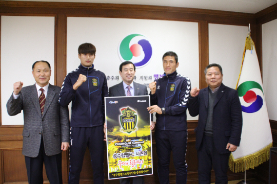 충주험멜 명예구단주 조길형 충주시장이 18일 집무실에서 2016년 충주험멜FC 연간회원권 구매릴레이 1호 구매행사를 진행했다.