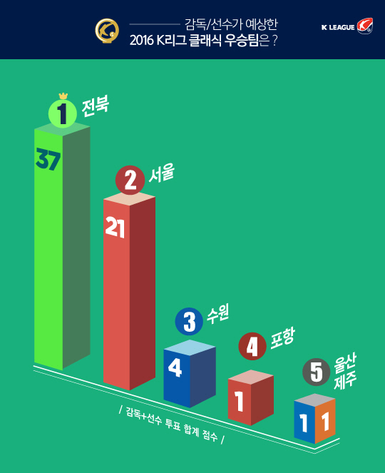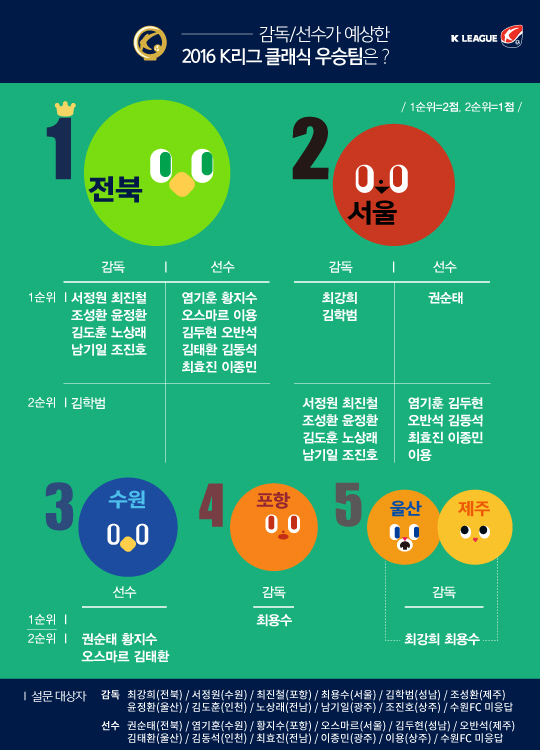 2년 연속 K리그 2위를 차지한 수원은 4점을 받아 3위를 차지했다. 권순태 황지수 오스마르 김태환이 2순위 우승후보로 수원을 선택했다. 포항은 4위(3위), 울산과 제주가 공동 5위(1점)에 올랐다. 울산의 1점은 최강희 감독이 행사한 2순위 표였다.