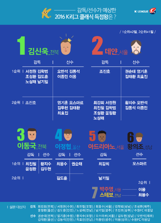프로연맹은 클래식 개막을 앞두고 각팀 감독과 주장을 대상으로 주요 이슈에 대한 설문 조사를 실시했다. ① 우승 예상팀, ② 예상 득점왕, ③ 올해 최고의 활약을 예상하는 선수에 대한 질문을 K리그 클래식 12개 구단 감독과 주장에게 물었다. 설문 조사는 각 항목에 대한 1,2순위 답변을 받았다. 결과는 1순위 2점, 2순위 1점을 부여해 총점으로 산출했고, 설문자가 소속팀은 선택할 수 없도록 정했다. 수원FC는 "K리그 클래식에 처음으로 참가하는 팀으로서 아직은 다른 팀과 선수를 평가하는 것이 곤란하다"는 이유로 답변을 정중히 거절했다.