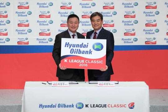 허정무 프로연맹 부총재와 박병덕 현대오일뱅크 부사장은 7일 서울 홍은동 그랜드힐튼호텔에서 후원 양해각서를 교환했다. 종합에너지 전문기업인 현대오일뱅크는 지난 2011년부터 프로축구 후원에 참여해 한국 축구 발전 및 저변확대에 중추적인 역할을 하고 있다. 특히 최상위리그인 K리그 클래식 뿐만 아니라 2부리그인 K리그 챌린지 및 4년 만에 부활한 R리그(2군리그)까지 타이틀 후원을 맡아 국내 축구 활성화에 기여하고 있다. 현대오일뱅크는 '현대오일뱅크 K리그 클래식'과 '현대오일뱅크 K리그 챌린지' 대회 타이틀 명칭권을 비롯해 LED보드, 롤링보드, A보드 경기장 그라운드 광고권, 경기장 내외 각종 설치물 광고권 등 다양한 광고권을 확보해 독점적 지위를 갖게 됐다. 이밖에 K리그를 활용한 각종 스포츠 이벤트 활동도 펼칠 계획이다.