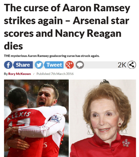 2012년 2월에도 램지는 부고 소식을 몰고왔다. 2월 11일 램지가 골을 기록하고 같은 날 팝스타 휘트니 휴스턴이 사망한채 발견됐다. 2013년 3월 21일 득점 후에는 농구스타 레이 윌리엄스와 피아니스트 보리스 베레초프스키가 운명을 달리했다. 그해 11 30일 램지는 다시 골을 넣었다. 그리고 그날 영화 '분노의 질주' 시리즈의 주연 배우 폴 워커가 차량사고로 죽었다. 2014년 8월에는 로빈 윌리엄스, 2016년 1월에는 데이비드 보위와 앨런 릭맨이 램지의 골과 엇비슷하게 죽었다.