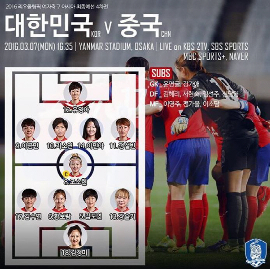 윤덕여호가 7일 오후 4시 35분 일본 오사카의 얀마스타디움에서 열릴 중국과의 2016년 리우데자네이루올림픽 여자축구 아시아지역 최종예선 4차전 선발명단을 확정했다.