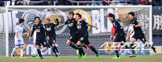 12일 오후 성남 탄천종합운동장에서 K리그 수원과 성남의 경기가 열렸다. 후반 선취골을 성공시킨 성남 김두현이 동료들과 환호하고 있다. 성남=김경민 기자 kyungmin@sportschosun.com / 2016.03.12.