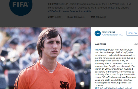 크루이프는 24일 스페인 바르셀로나에서 폐암 투병 끝에 사망했다. 선수 시절 아약스, 바르셀로나, 페예노르트 등에서 뛰며 전성시대를 보냈다. 특히 '토탈사커'의 창시자로 유명했다. 네덜란드 대표팀의 핵심으로 1974년 서독월드컵 준우승을 이끌었다. 크루이프는 작년 10월 폐암 판정을 받았다. 크루이프측은 그 동안 폐암의 진행 상황에 대해 이렇다할 언급을 하지 않았다.