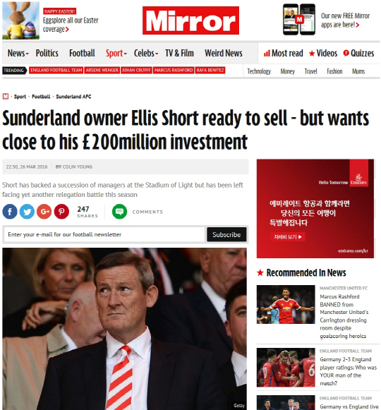 엘리스 쇼트 선덜랜드 구단주가 팀 매각에 나섰다.