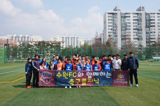 수원FC는 25일 수원 만석공원 인조구장에서 수원광교장애인주간보호시설 30명을 대상으로 축구 클리닉을 실시했다. 이날 행사는 시민들로부터 받은 관심과 사랑을 축구를 통해 돌려주기 위해 진행하는 사회공헌활동의 일환으로 수원광교장애인주간보호시설과는 지난해부터 월 1회 축구클리닉을 진행하고 있다.