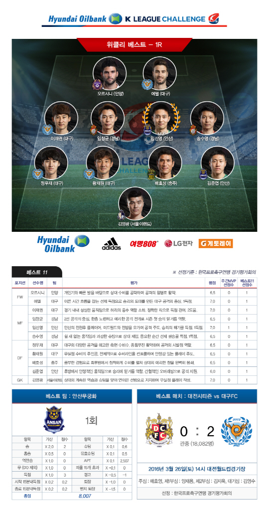 최고의 공격수는 오르시니(안양)과 에델(대구)가 선정됐다. 베스트 미드필드에는 임선영을 비롯해 임창균 송수영(이상 경남) 이재권(대구)가 이름을 올렸다. 정우재 황재원(이상 대구) 배효성(충주) 김준엽(안산)이 최고의 수비수였다. 서울이랜드의 김영광이 최고의 수문장으로 뽑혔다.