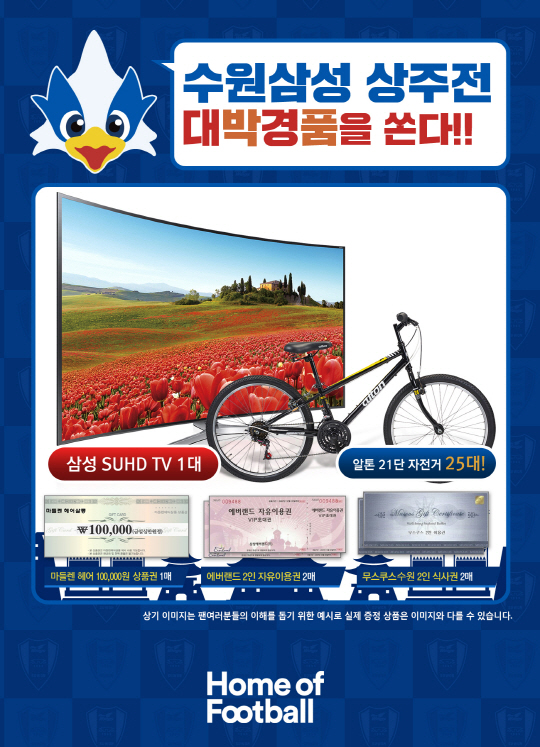 수원 삼성이 오는 4월 2일 수원월드컵경기장에서 펼쳐지는 상주 상무와의 K리그 클래식 3라운드 경기에서 대박 경품 잔치를 벌인다.