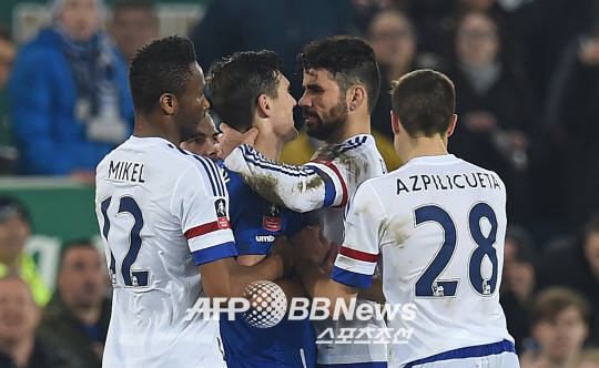 코스타는 13일(이하 한국시각) 영국 구디슨 파크에서 벌어진 에버턴과의 2015~2016시즌 잉글랜드 FA컵 8강전에서 0-1로 끌려가던 후반 39분 에버턴의 가레스 배리와 몸싸움을 벌이다 경고 누적으로 퇴장당했다. 그런데 이상한 장면이 포착됐다. 코스타가 배리의 목 주위를 무는 듯한 행동이 중계화면에 잡힌 것이다. 루이스 수아레스(바르셀로나)의 '전매특허'인 '깨물기' 논란이 일어났다.