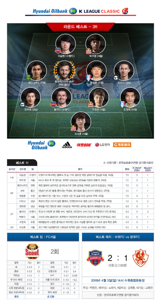 클래식 3라운드 베스트 11도 공개됐다. 최고 공격수에는 박주영(서울) 이승현(수원FC)이 이름을 올렸다. 베스트 미드필더에는 MVP 코바를 필두로 레오나르도(전북) 권창훈(수원) 티아고(성남)가 선정됐다. 최고의 수비수에는 장학영(성남) 블라단(수원FC) 박용우(서울) 조원희(수원)가 뽑혔다. 서울의 유상훈은 최고 골키퍼로 선정됐다. 3라운드 최고의 팀은 서울, 베스트 매치는 수원FC와 광주전(2대1 수원FC 승)이었다.