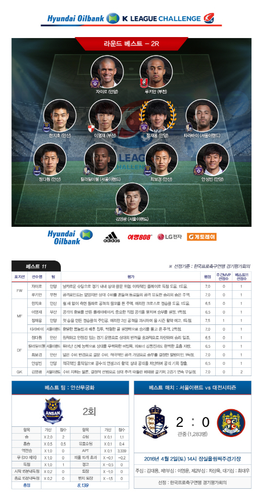 한편, 챌린지(2부 리그) 2라운드 MVP는 정재용(안양)이 차지했다. 챌린지 베스트11에는 정재용을 비롯해 자이로 안성빈(이상 안양) 루키안(부천) 한지호 정다훤 최보경(이상 안산) 타라바이 김영광 칼라일미첼(이상 서울이랜드) 이영재(부산)가 선정됐다.