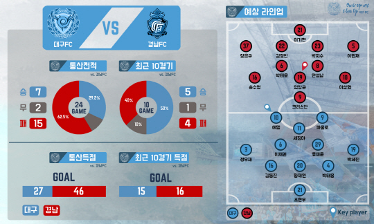 대구는 방심하지 않고 오프기간 동안 연습경기를 통해 선수들의 컨디션을 조절하는 등 경남전을 신중하게 준비하고 있다. 이영진 감독은 "지난 시즌 원정 성적이 더 좋았다. 올 시즌에는 홈 팬들에게 많은 승리를 안겨드리고 싶다. 반드시 승리해서 승리와 연승 두 가지를 다 이루겠다"고 밝혔다.