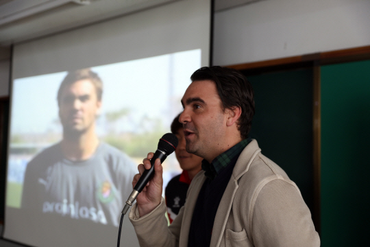 대구FC 유소년 총 감독 미겔 앙헬이 일일강사로 변신해 11일 대구 성당초등학교를 방문했다.