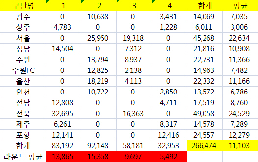 1만638명→3431명(광주), 4783명→1228명(상주), 1만2825명→2138명(수원FC), 1만8219명→4113명(울산), 1만722명→2850명(인천), 1만2808명→4711명(전남)….