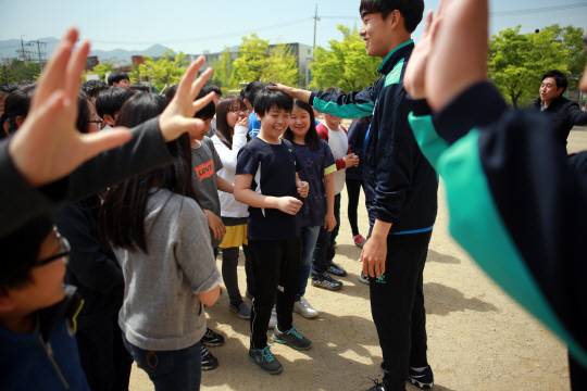 특히 월서중에서 열린 미니게임은 열기가 대단했다. 게임을 시작하자 체육수업을 하던 다른 반 학생들이 관중이 되어 경기를 지켜봤고, 선수들이 드리블을 하거나 패스를 하자 환호성이 터져 나왔다. 그 열기는 프로그램의 마지막 순서인 팬 사인회까지 이어졌다. 사인회가 열린 강당에 약 400여 명의 학생이 모이는 등 성황을 이뤘고, 선수들은 학생들의 이름을 일일이 묻고 악수를 하며 호응에 보답했다. 김성원 기자 newsme@sportschosun.com