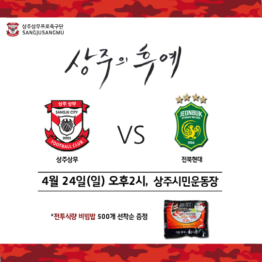 비빔밥을 주메뉴로 하는 전투식량은 비빔밥의 고장 전주를 연고지로 하는 전북에 대한 상주의 센스 있는 반격이다. 지난 포항전 승리로 홈경기 무패행진을 이어가고 있는 상주는 이번 전북과의 홈경기를 전쟁으로 선포하고 반드시 승리하겠다는 의지를 내비치고 있다. 이에 경기장을 찾는 관중들 역시 전투에 동참하자는 의미에서 선착순으로 500명에게 전투식량 비빔밥을 제공한다. 그야말로 '전투태세'다.