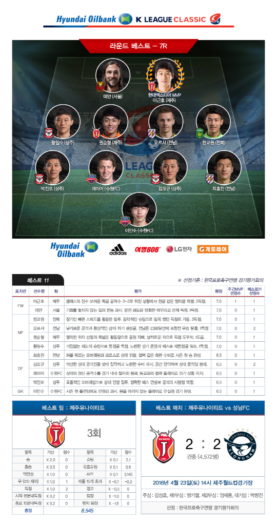 클래식 7라운드 베스트 11도 공개됐다. 최고 공격수에는 이근호와 함께 데얀(서울)이 이름을 올렸다. 베스트 미드필더에는 한교원(전북) 오르샤(전남) 권순형(제주) 황일수(상주)가 선정됐다. 최고의 수비수에는 최효진(전남) 박진포 김오규(이상 상주) 레이어(수원FC)가 뽑혔다. 수원FC의 이인수는 최고 골키퍼로 선정됐다. 7라운드 최고의 팀은 제주, 베스트 매치는 제주와 성남전이었다.
