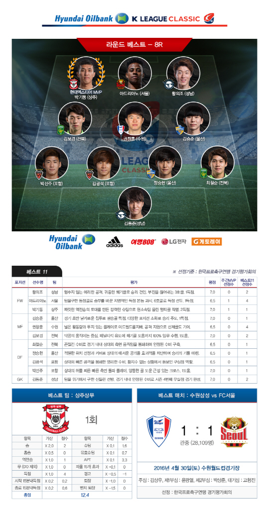 8라운드 베스트팀은 상주 상무, 베스트 매치는 수원 삼성과 FC서울의 슈퍼매치였다.