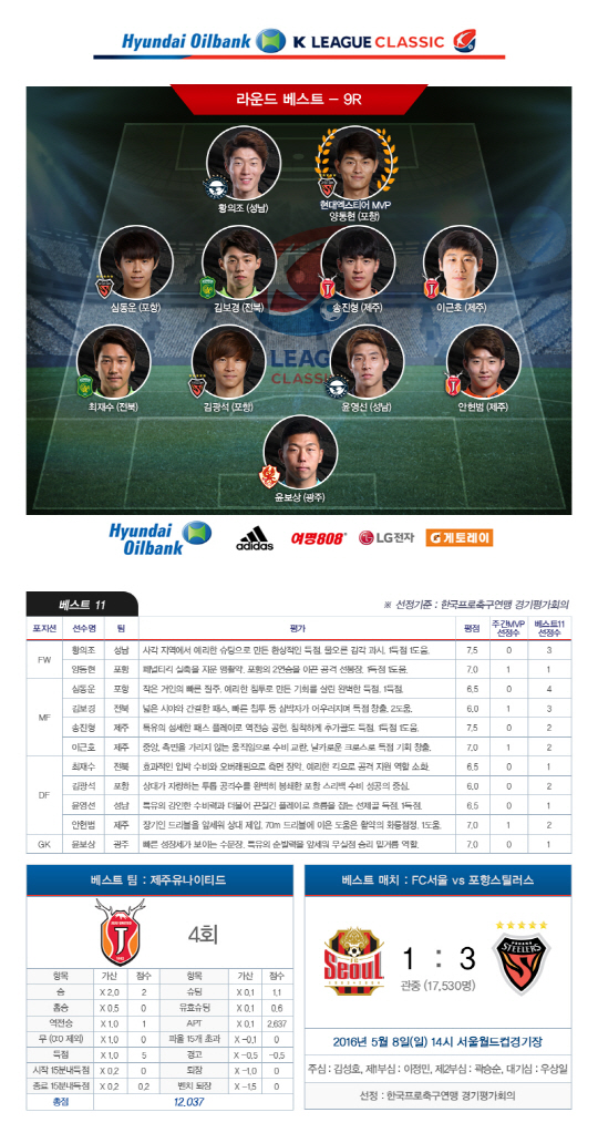 클래식 9라운드 베스트11도 공개됐다. 최고 공격수에는 양동현과 함께 황의조(성남)이 이름을 올렸다. 베스트 미드필더에는 심동운(포항) 김보경(전북) 송진형 이근호(이상 제주)가 선정됐다. 최고의 수비수에는 최재수(전북) 김광석(포항) 윤영선(성남) 안현범(제주)가 뽑혔다. 광주의 윤보상은 최고 골키퍼로 선정됐다. 9라운드 최고의 팀은 제주, 베스트 매치는 서울-포항전이었다.
